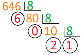 Para convertir un número en base decimal a base octal se divide dicho número entre 8, dejando el residuo y dividiendo el cociente sucesivamente hasta obtener cociente 0, y los restos de las divisiones en orden inverso indican el número en octal. Para pasar de base 8 a base decimal, solo hay que multiplicar cada cifra por 8 elevado a la posición de la cifra, y sumar el resultado.