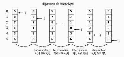 EcuRed (s.f.-d) ha mencionado en un estudio que es un sencillo algoritmo de ordenamiento. Funciona revisando cada elemento de la lista que va a ser ordenada con el siguiente, intercambiándolos de posición si están en el orden equivocado. Es necesario revisar varias veces toda la lista hasta que no se necesiten más intercambios, lo cual significa que la lista está ordenada. Este algoritmo obtiene su nombre de la forma con la que suben por la lista los elementos durante los intercambios, como si fueran pequeñas burbujas.